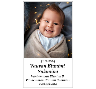 Lähettämällä kuvan tietoineen ja maksettuasi ilmoituksen annat lehdelle suostumuksen kuvan ja tietojen julkaisuun. Ilmoituksen jättäjä kantaa täyden vastuun siitä, että tietojen julkaisuun on myös lapsen huoltajien suostumus. * (valinnainen)